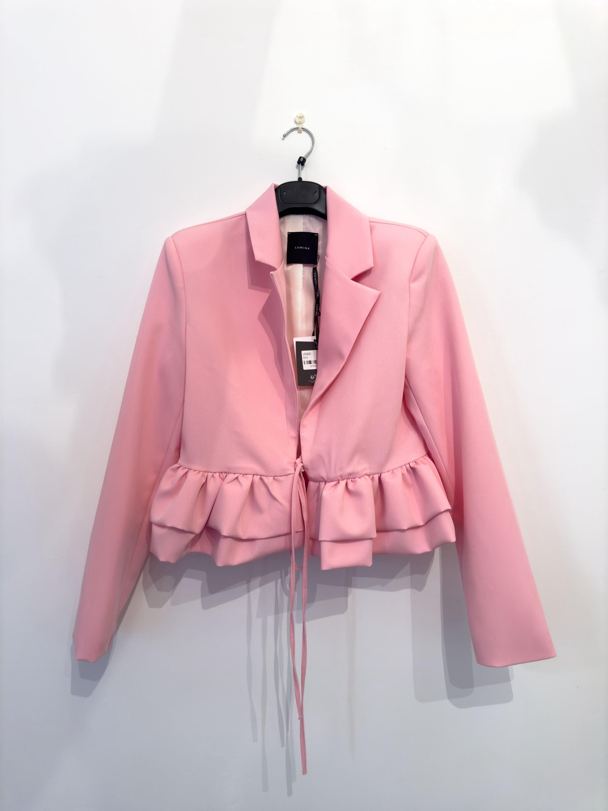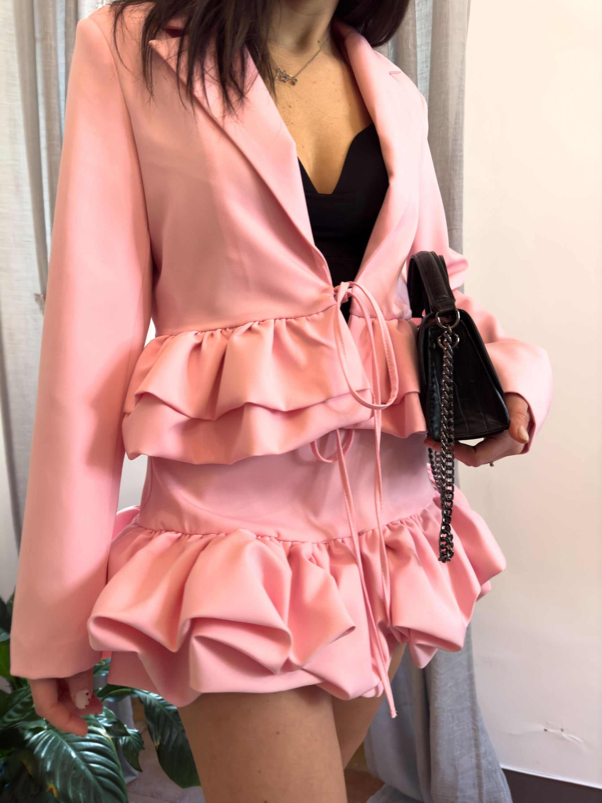 Giacca rosa con balze e fiocco per la chiusura