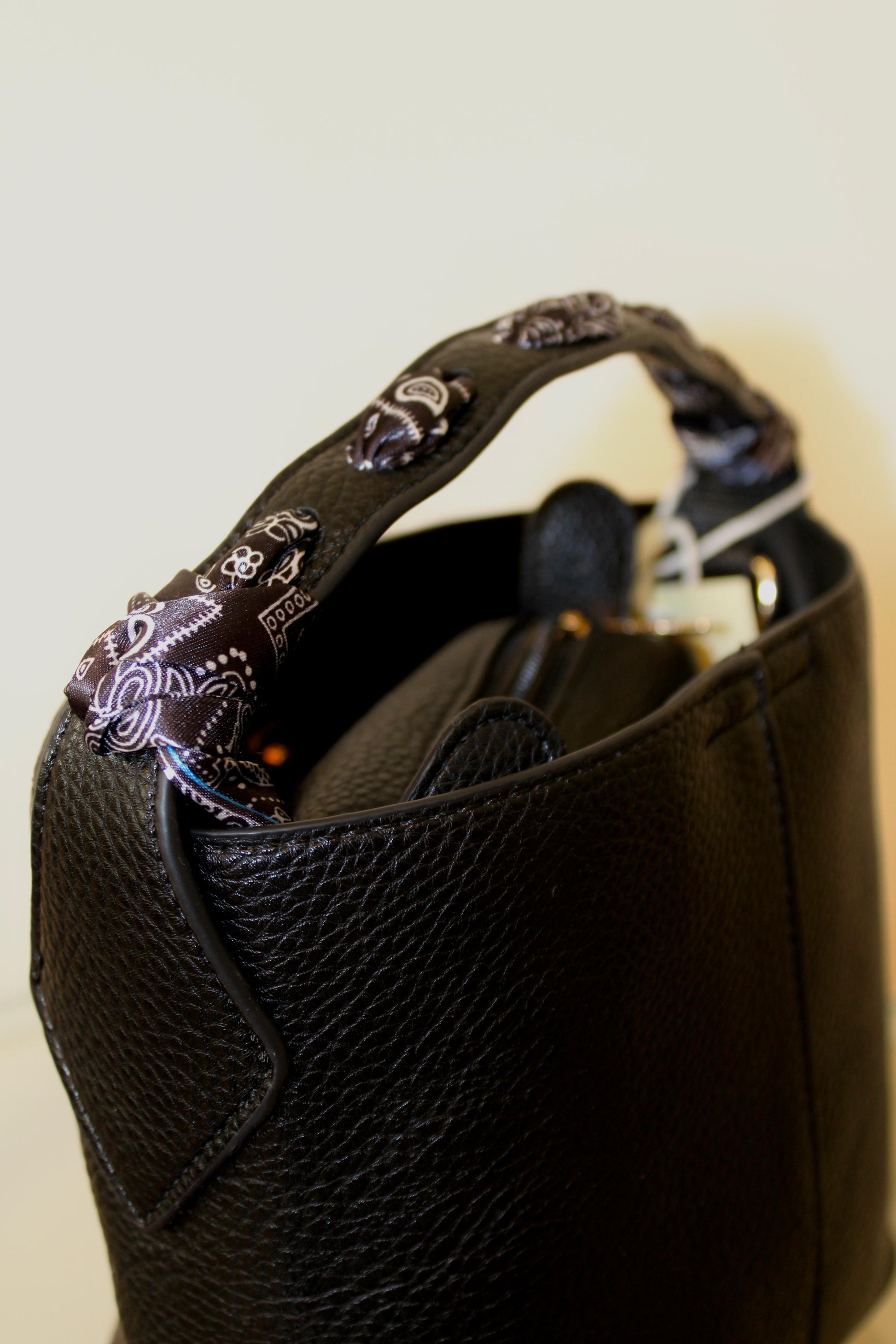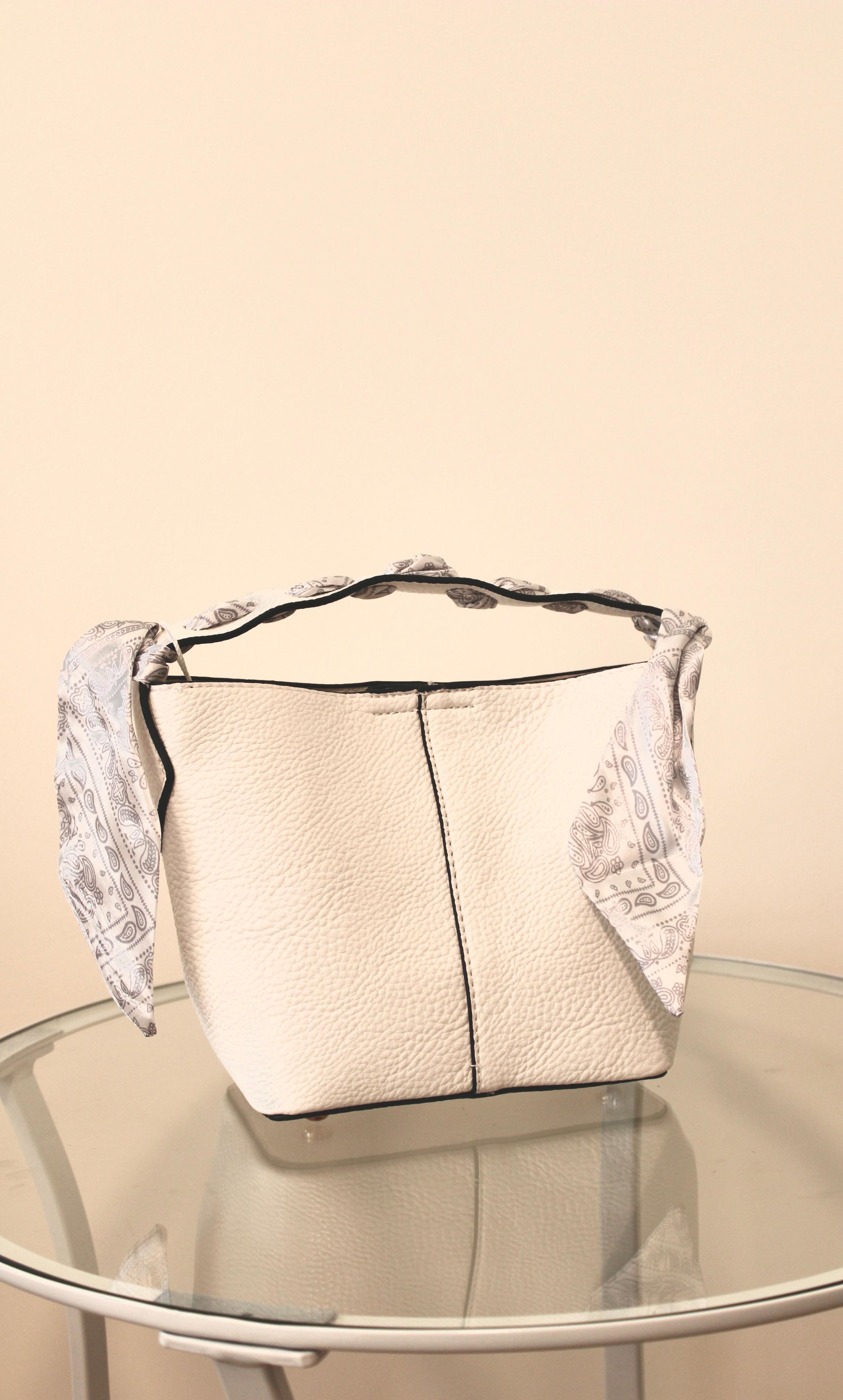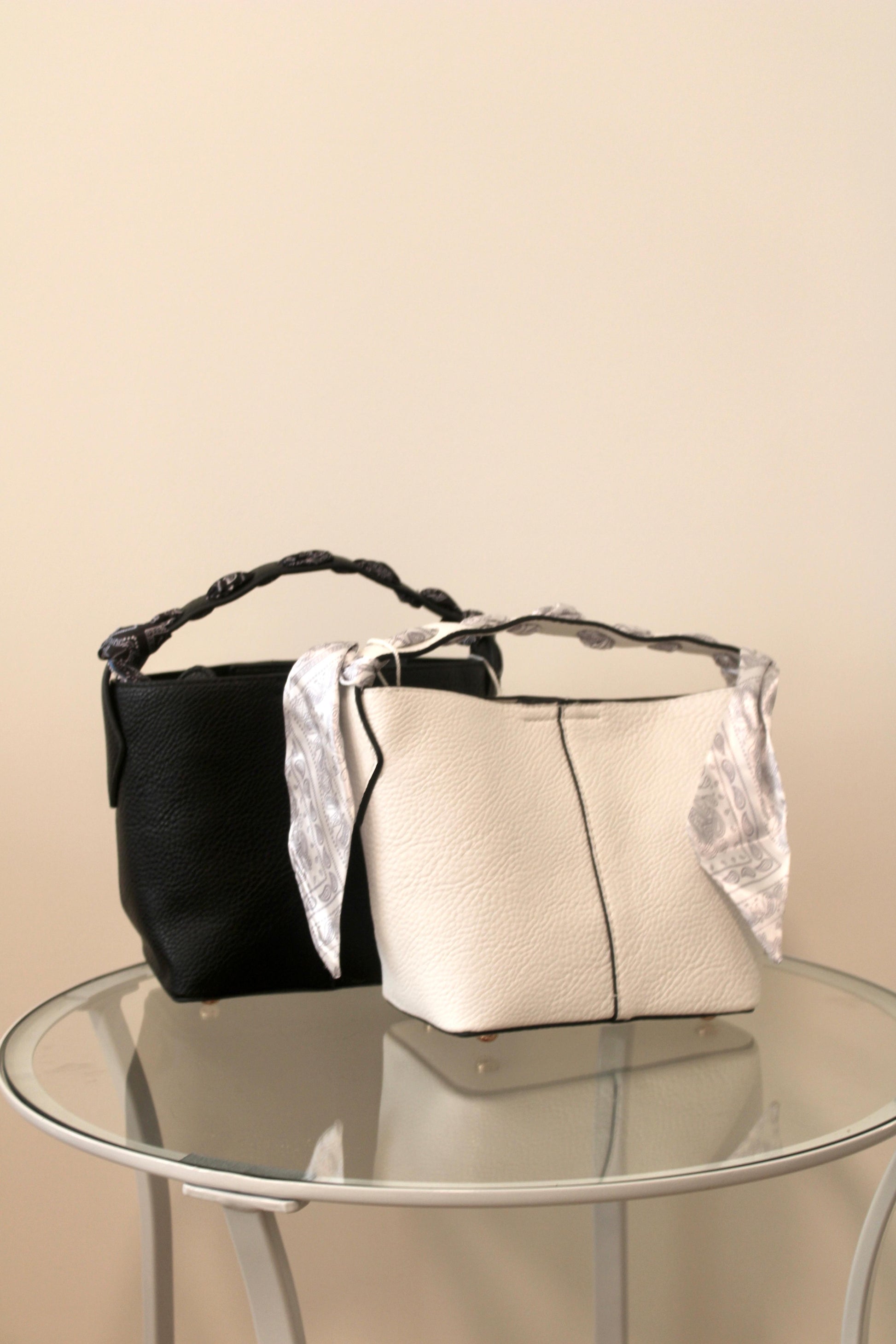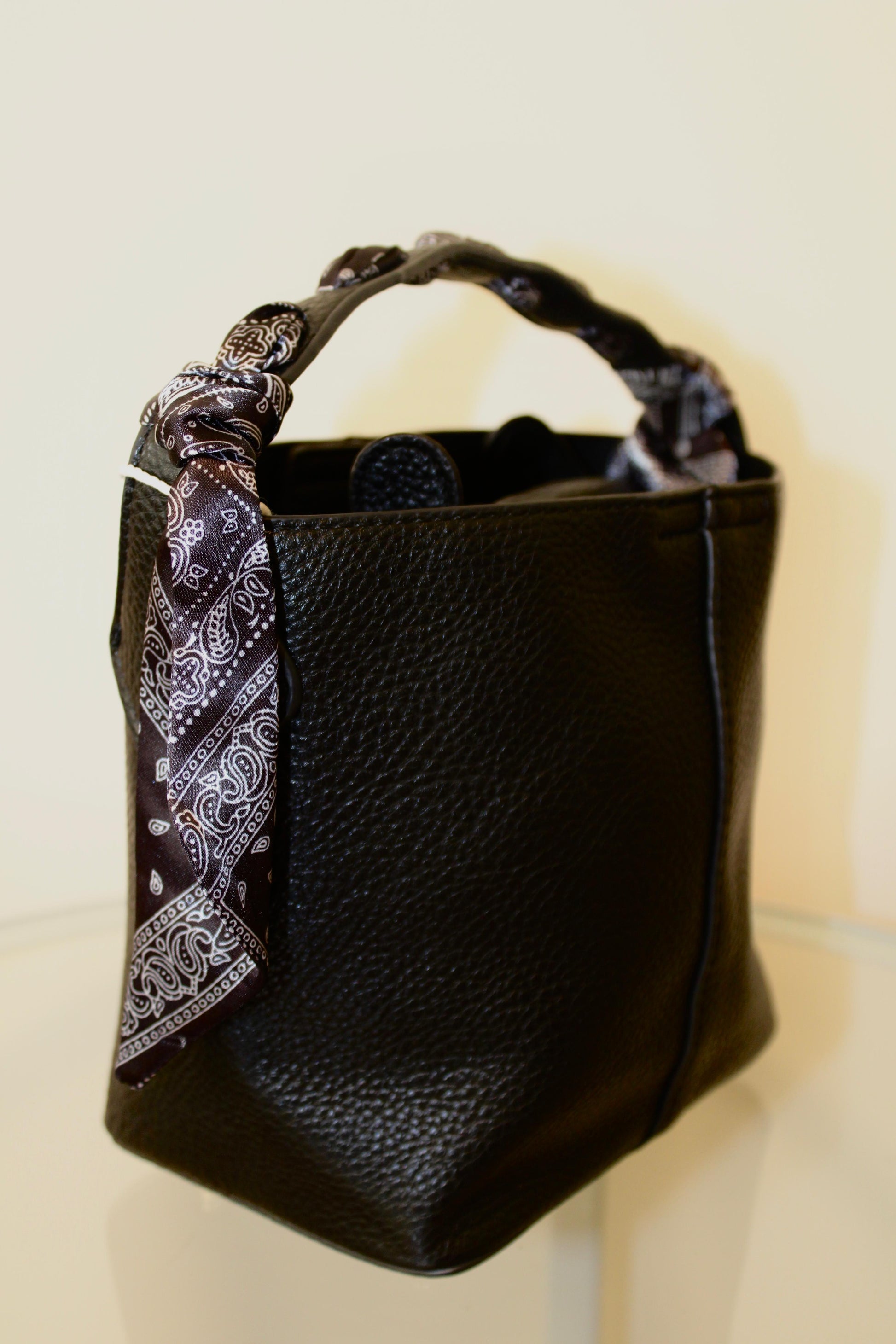 Borsa secchiello con foulard incluso e pochette interna.